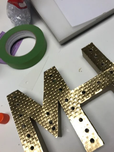 Turn your letters over and poke your craft knife or scissors through the back of the letter and cut along the out side edge. The letter is hollow on the inside and usually has a zig zag piece of car board inside to give it support but you can easily pull that out. I had to do a few extra steps to get my letters to look like my logo but I won’t go into that here cause yours won’t look like my logo, right?