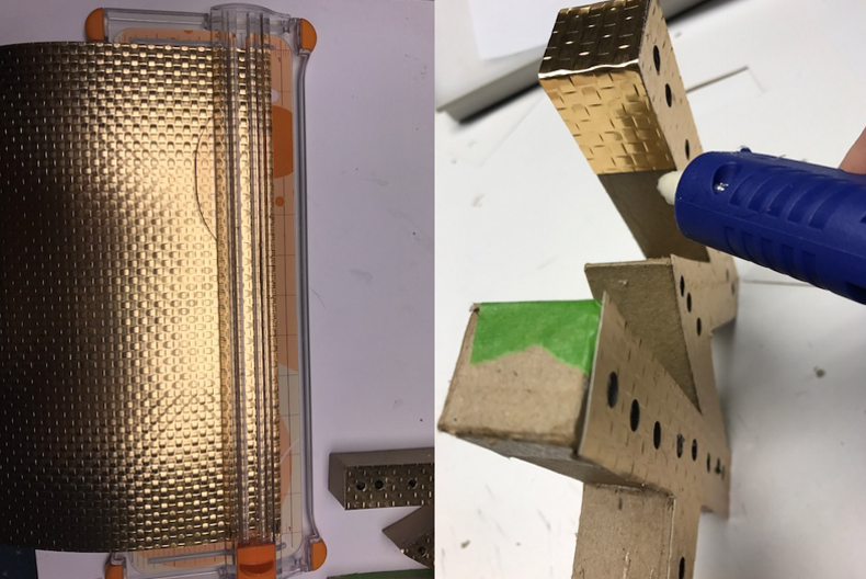 Glue your cut out paper letter to the front of the cardboard letter making sure to line up the holes. I used a glue stick but, in hind sight, the hot glue would have work just as good and it would have dried faster. I had to wait a half hour…