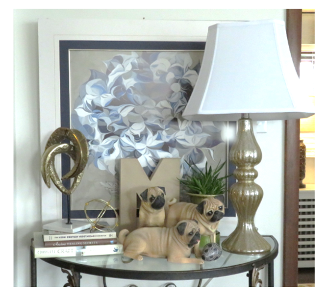 I brought in a few plants to from other rooms to see how they would work. I tried out a couple of air plants but they didn’t quite fit the vibe. I brought in a jade plant but it was a bit too short. Finally I settled on a small aloe in a green planter and, bingo! I liked the height and the green was a pretty compliment to my blue hydrangea print.