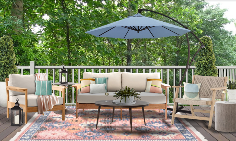 Tip: Mixing and matching patterns can add visual interest without overwhelming the space. Combine a small, medium, and large-scale pattern on things like area rugs, outdoor pillows, upholstered cushions, or outside curtains, for a dynamic and interesting layered look.